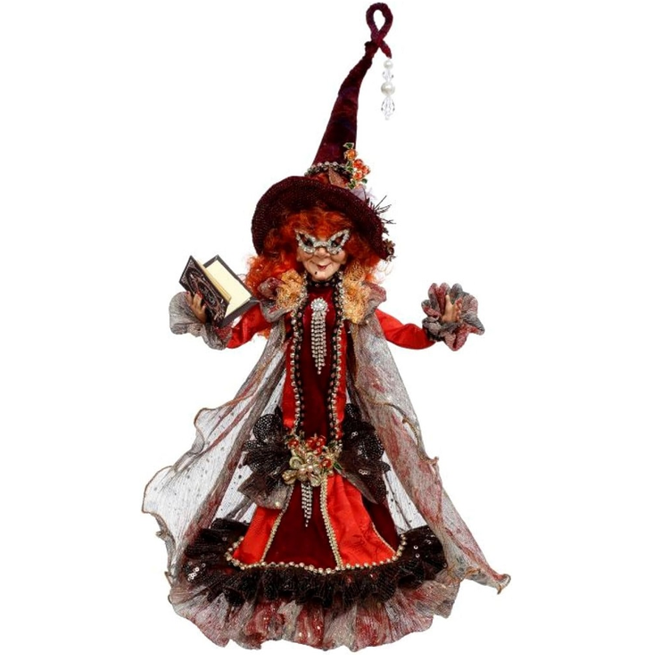 She holds a detailed spellbook and features luxurious, layered fabrics, metallic accents, and striking textures. The fully poseable design allows you to customize her look—whether she's casting spells from your mantel, greeting guests from a table, or adding mystery to a shelf display. A true statement piece for collectors and seasonal decorators alike.